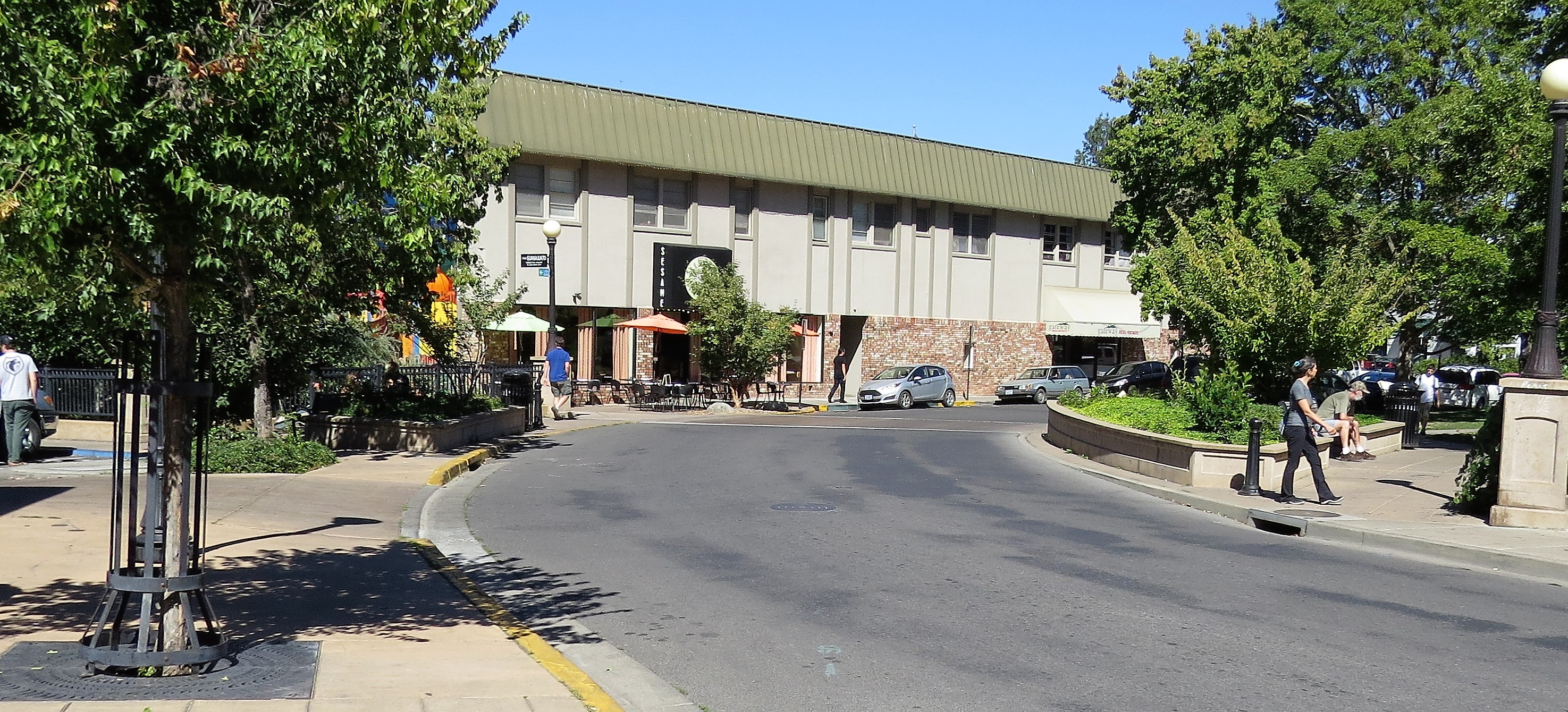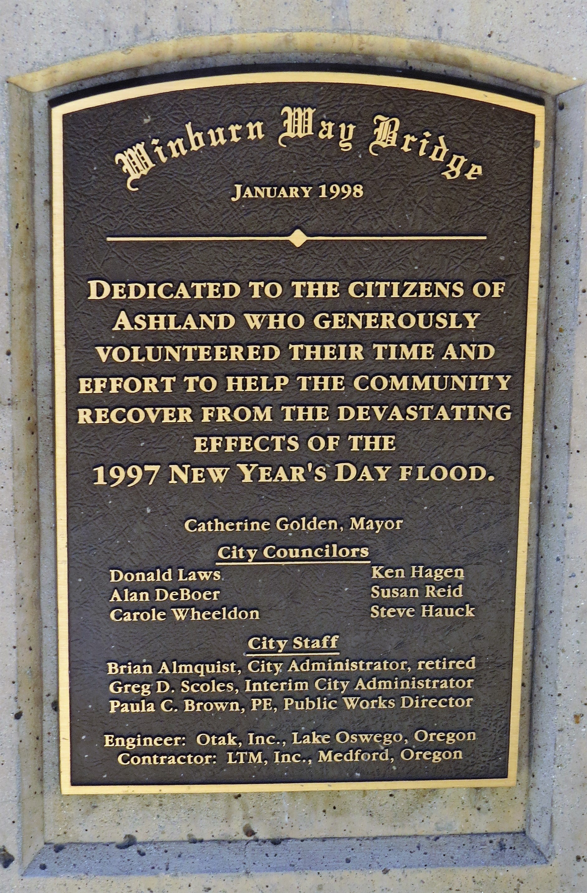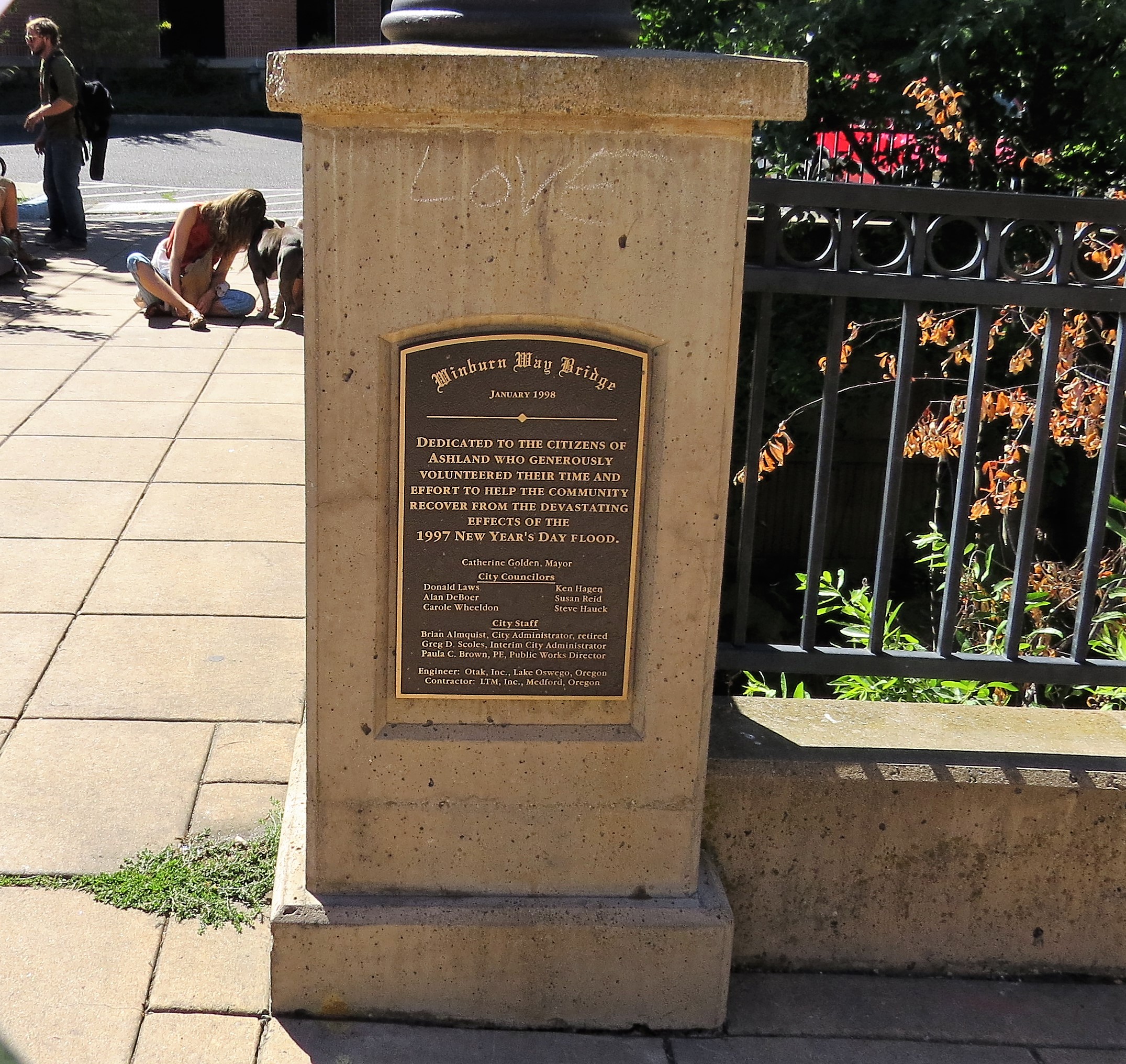 This bridge was built in 1997 and dedicated in 1998. It replaced the previous bridge which caused the flooding of the Plaza on January 1, 1997. The previous bridge had a much smaller opening for Ashland Creek, and when the creek flooded, debris from the swollen creek blocked the bridge opening, creating a dam that diverted the water through the plaza, flooding the buildings along the creek. The new bridge hopefully has a wide enough opening to prevent this from happening in the future.
