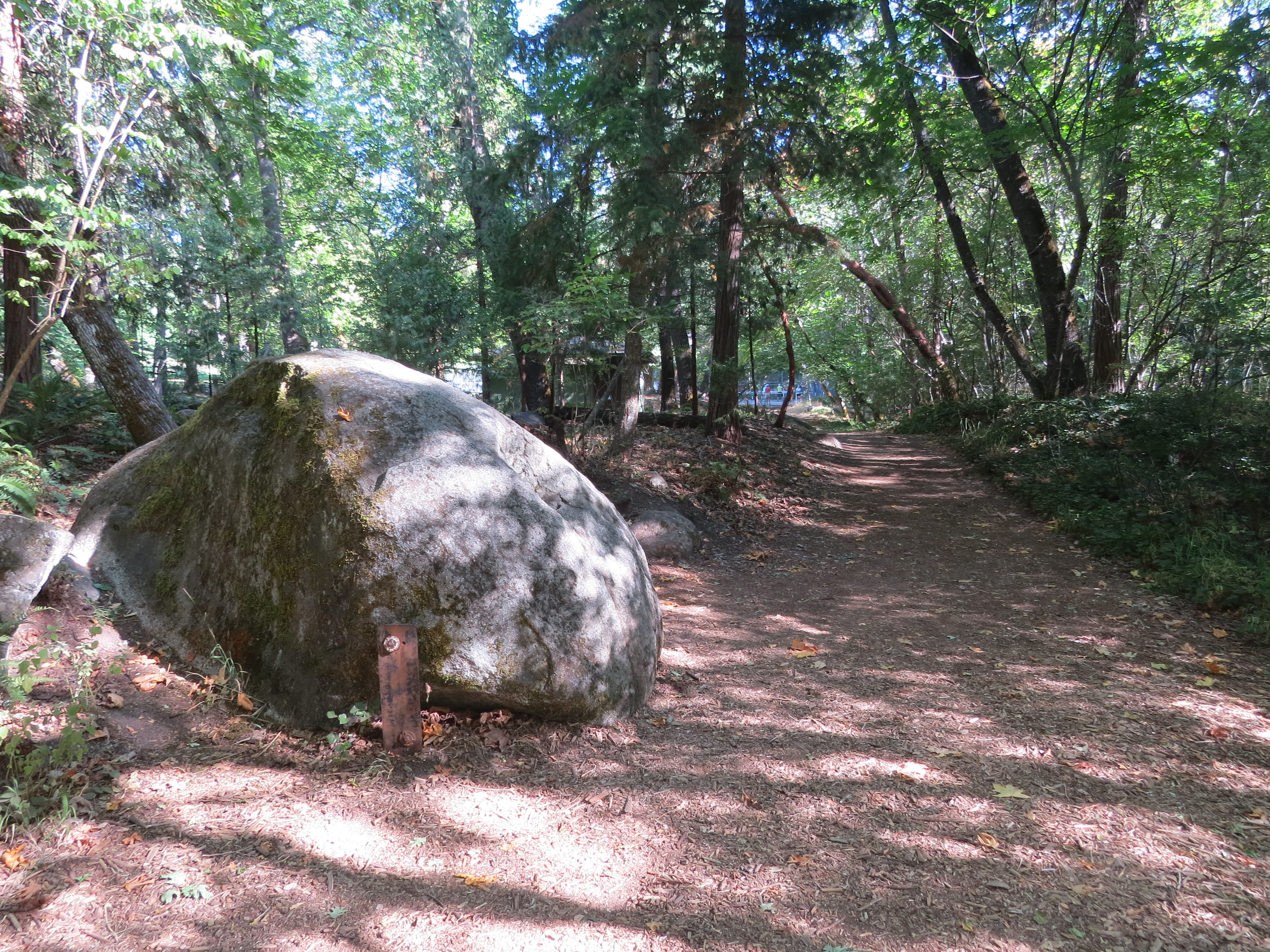 One easy access is by parking on the loop road just above the upper duck pond, just before Winburn Way intersects Granite street. From the parking area, walk toward the duck pond. Heading toward the right side of the duck pond, take the unpaved path, which is just to the right of the paved sidewalk. Walk down this path (which parallels Ashland Creek) until you find the large boulder on the left side of the path. The boulder is roughly half way between the duck pond and the tennis courts. The plaque is on the opposite side of the boulder.