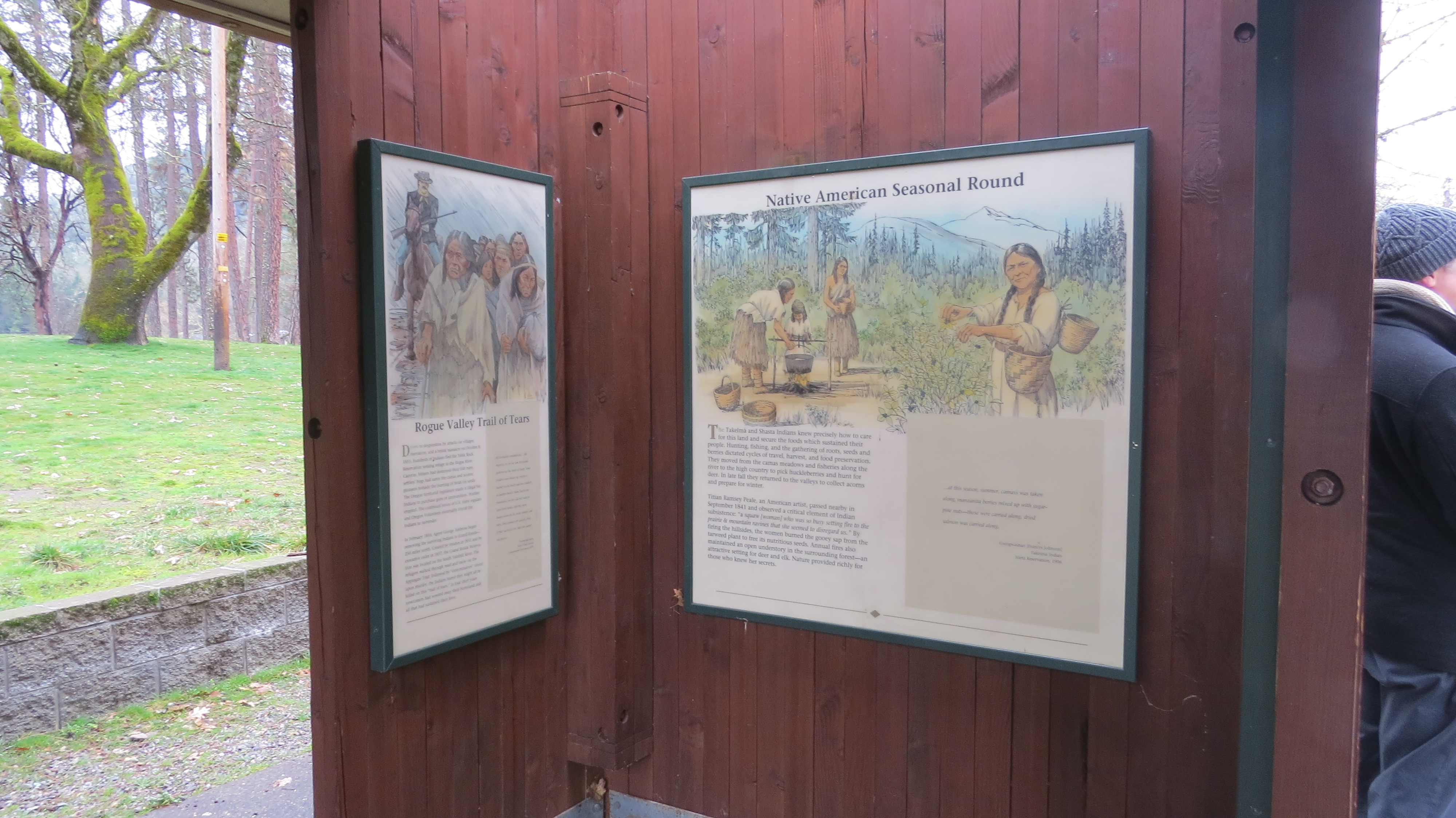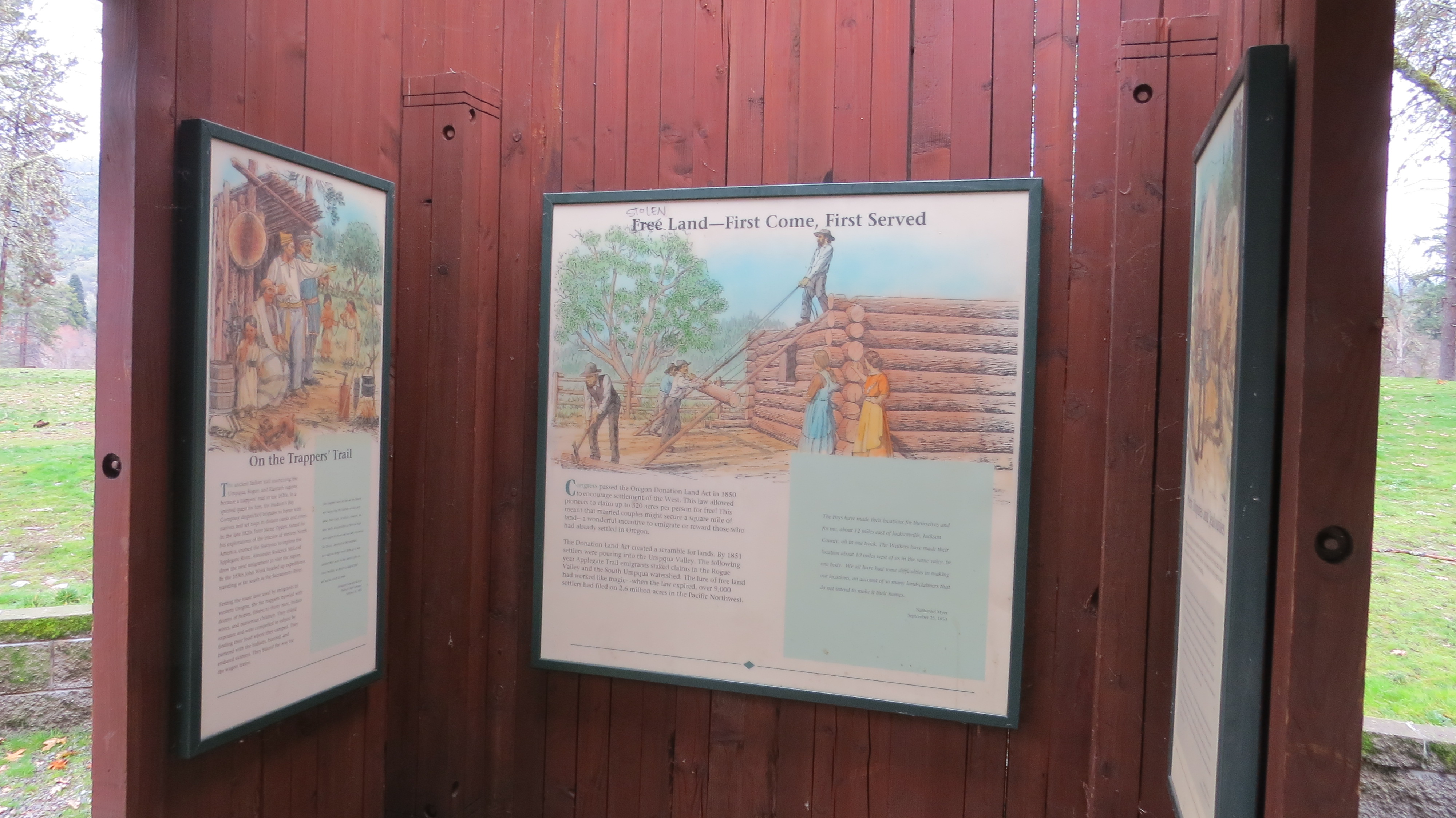 This kiosk in the Valley of the Rogue State Park provides information on the Native Americans and European settlers who arrive in Oregon in the mid eighteen hundreds. It is located along the route of the 1846 Applegate Trail.