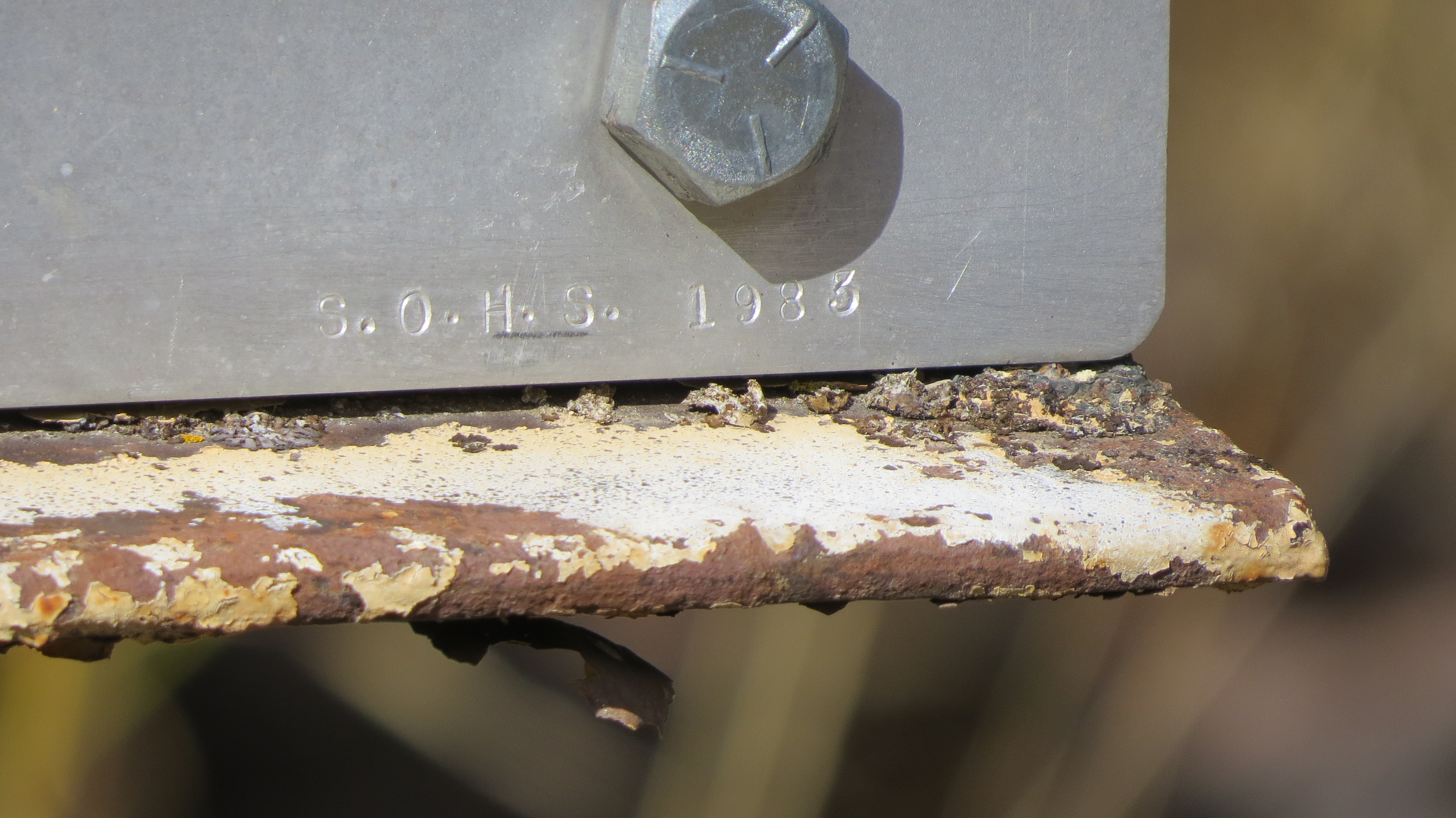 The marker is the traditional welded railroad rail used by the Trails West organization.