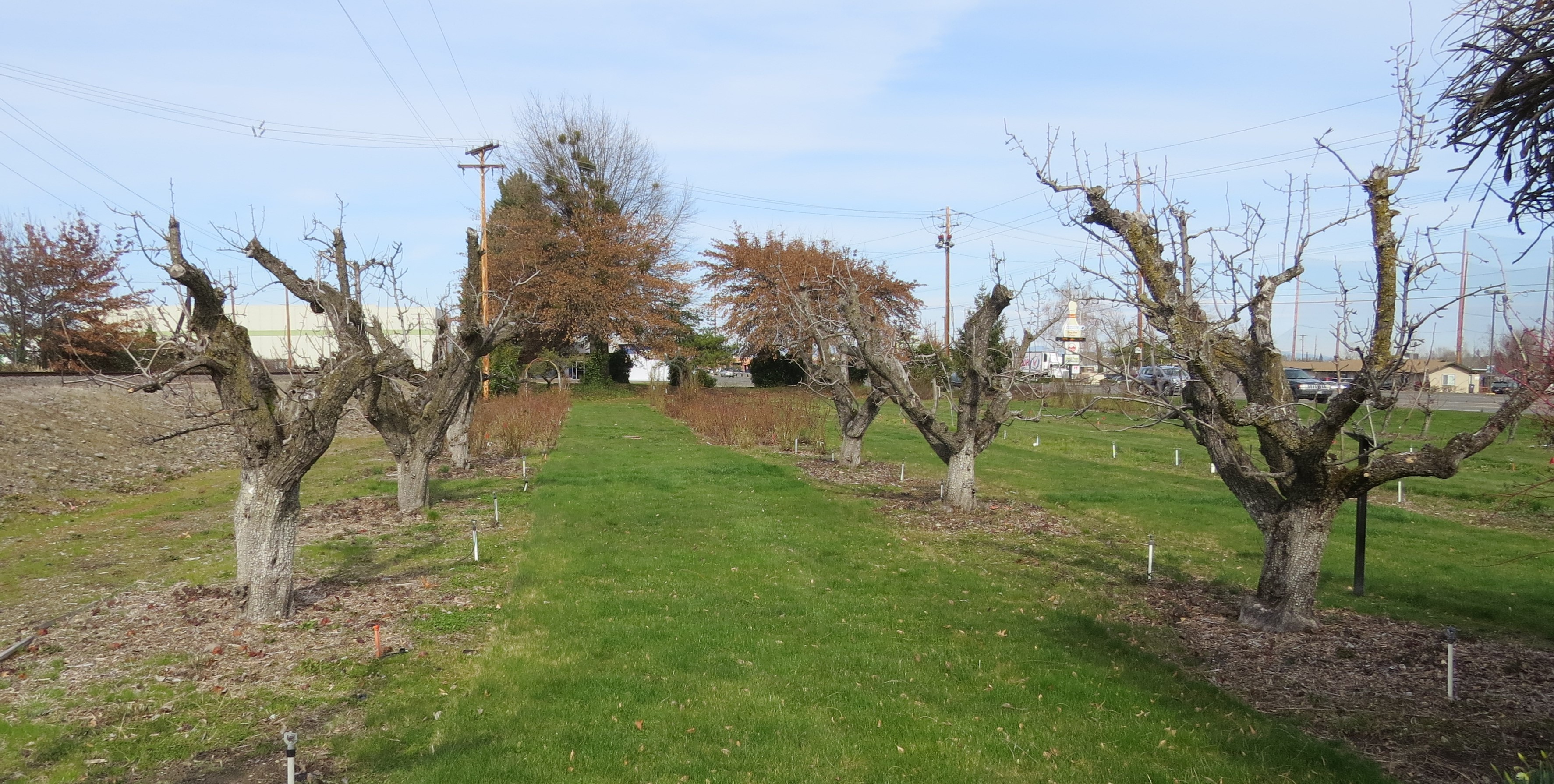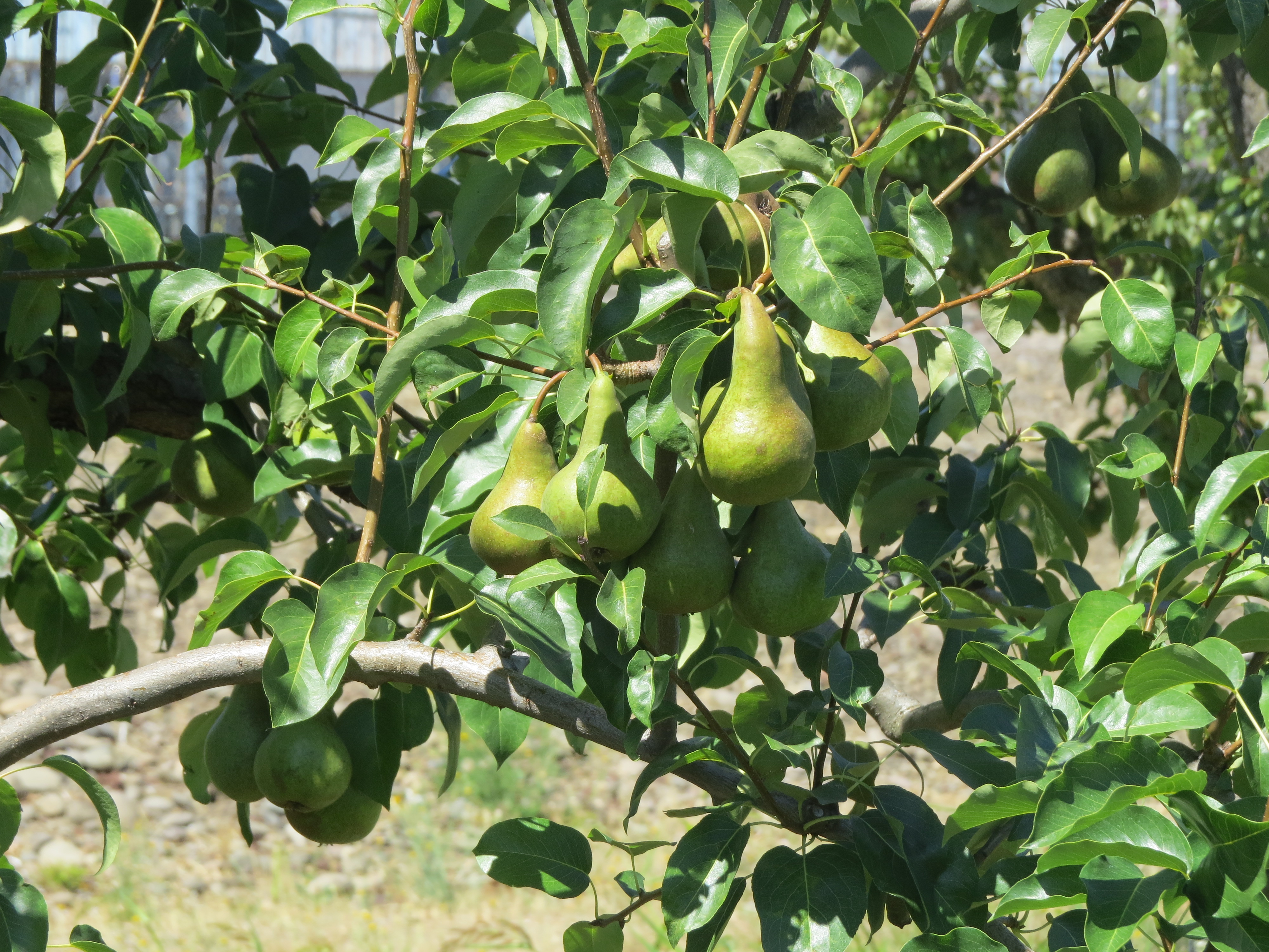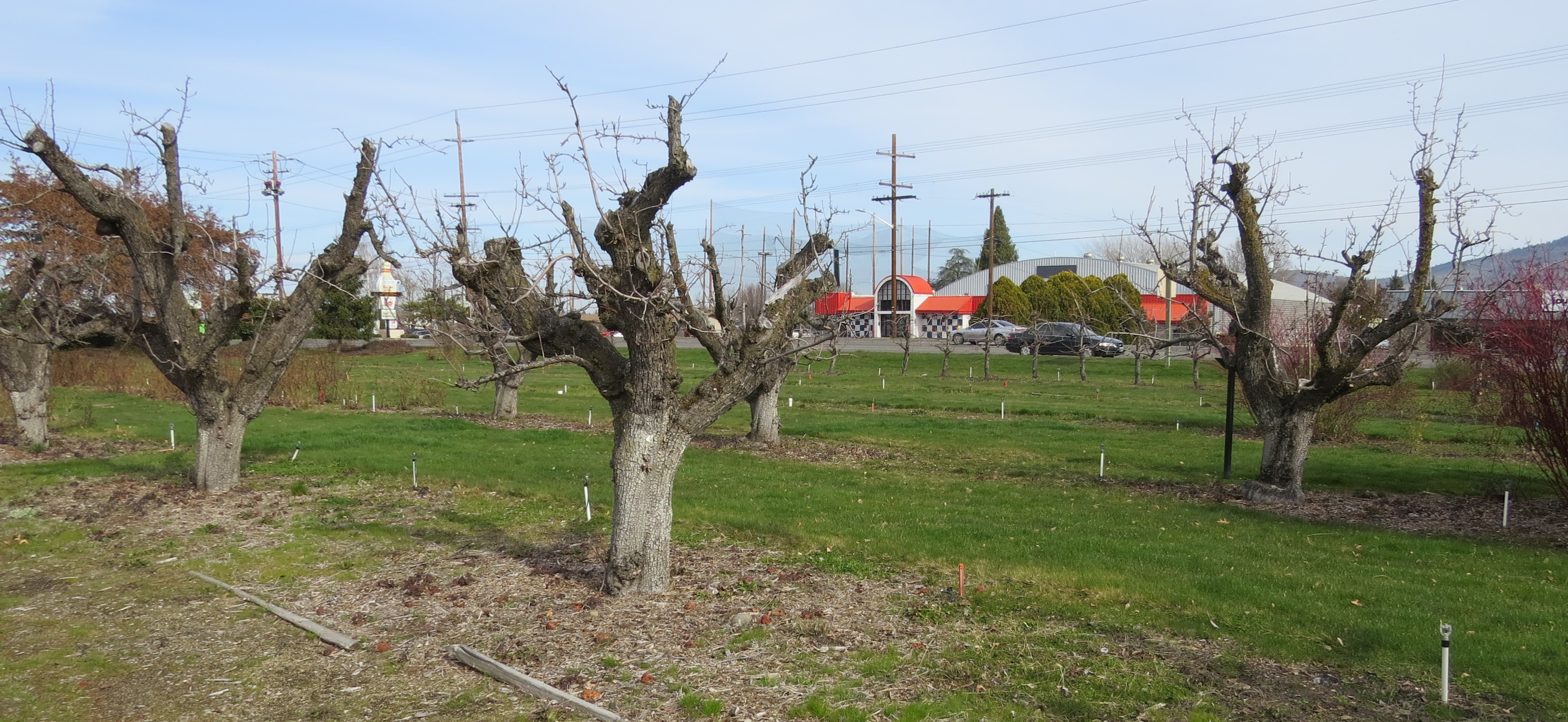 From Medford, drive south on Highway 99, and turn right at Lowry Lane into the Harry & David parking lot. The address is 2500 South Pacific Highway. Turn right again and drive (parallel with the railroad tracks) to the end of the short road, parking before the small shed. Walk around the shed to find the small grove of Comice Pear trees.