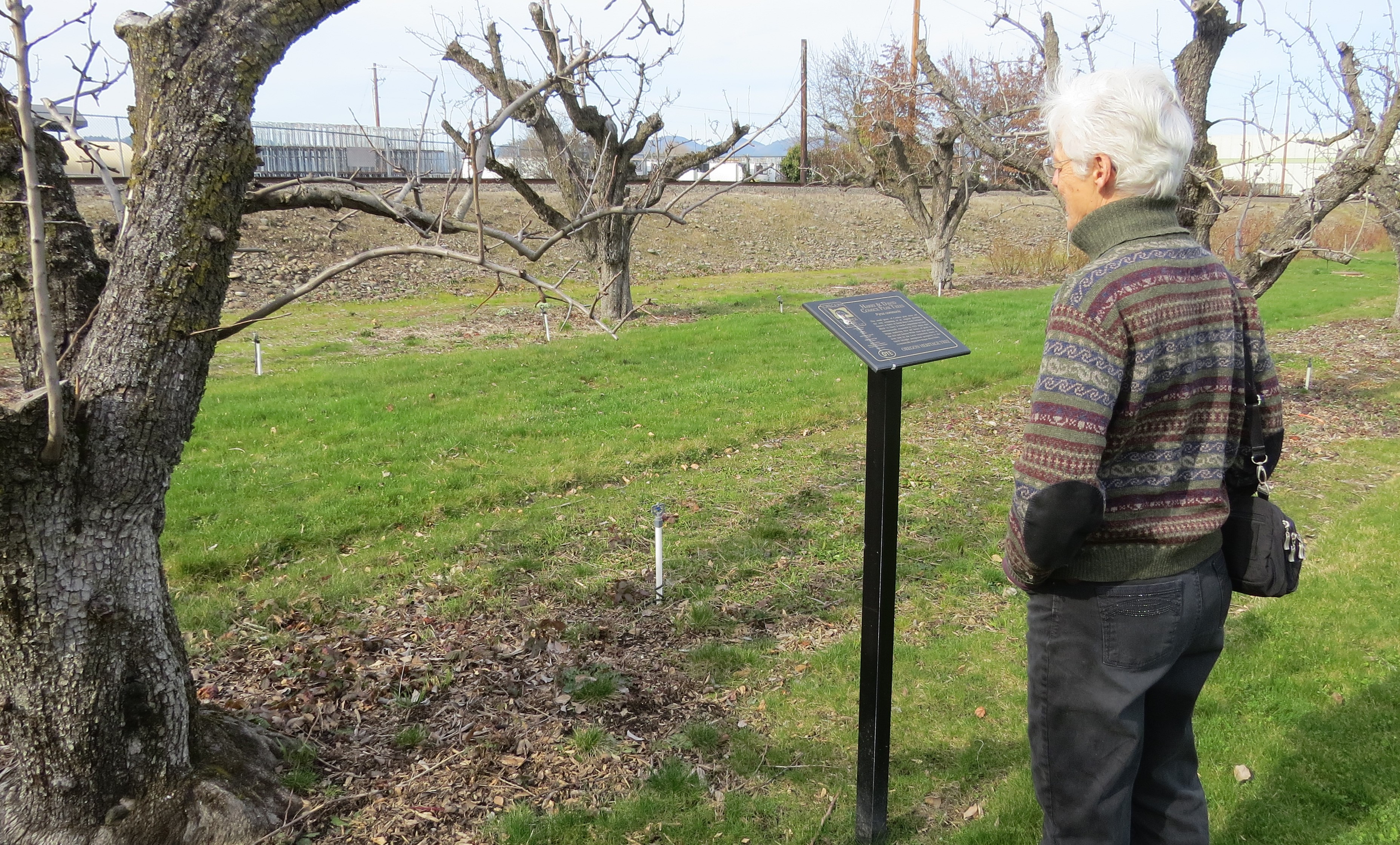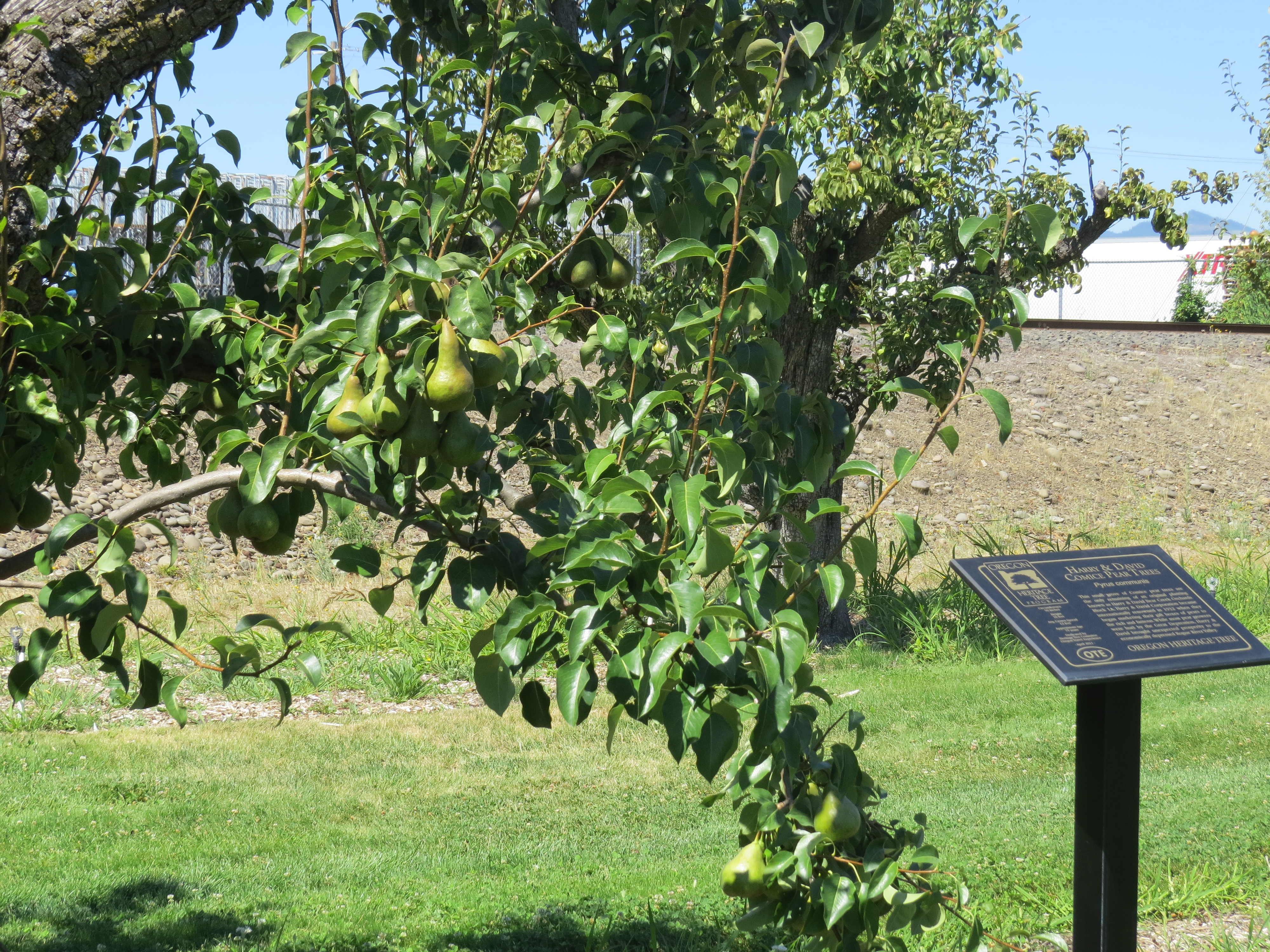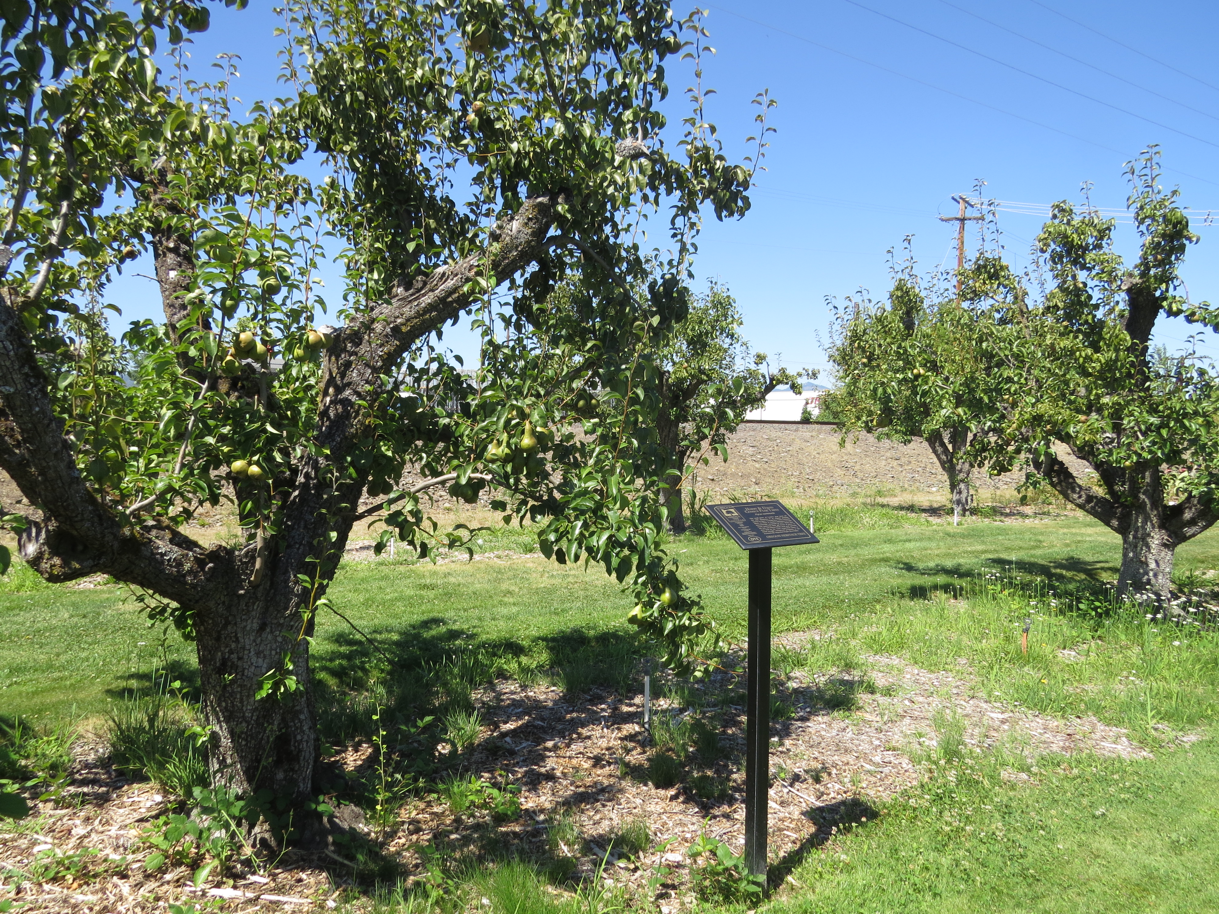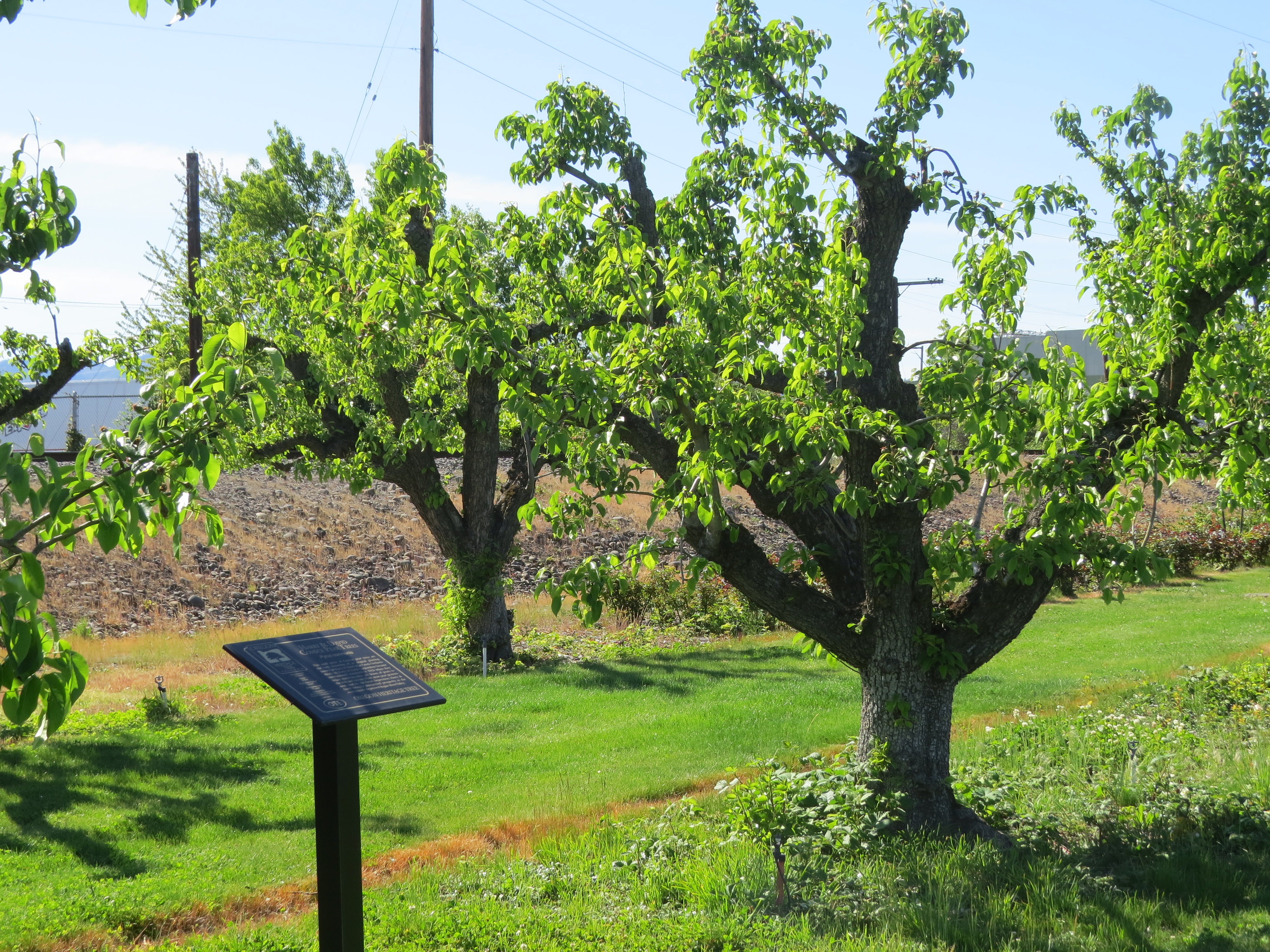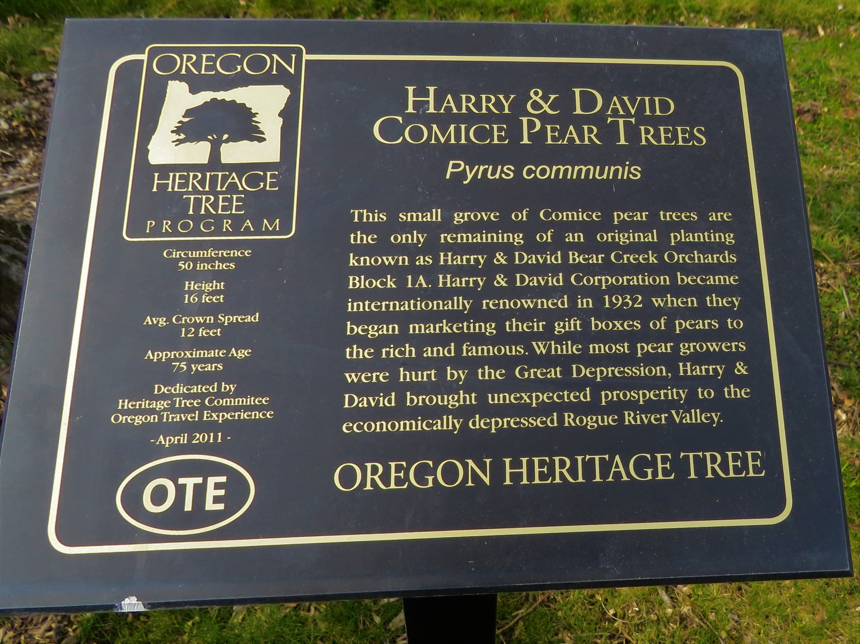 According to the sign, these few Comice pear trees were part of an original planting in Bear Creek Orchards Block 1A. Harry and David became internationally know in 1932 for their gift boxes of pears. During the Great Depression Harry & David helped the local economy