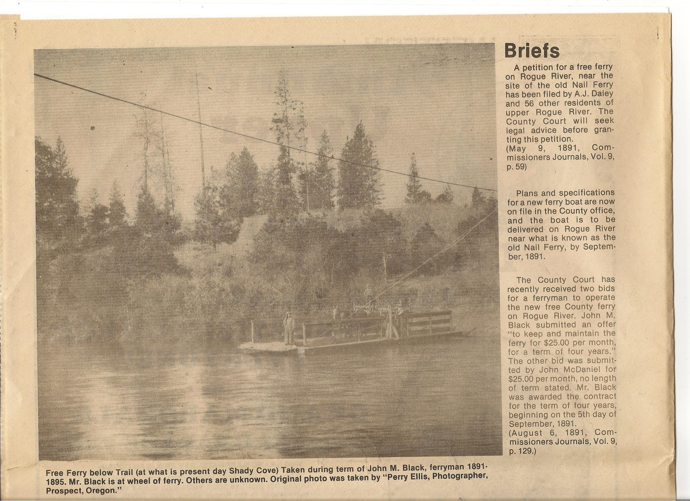 Information from Mark Lawrence: J. C, Hannah applied to the County Commissioners to keep a ferry across Rogue River at the Raimey Place in June 1869. This ferry continued in operation until about July, 1874. A search of the records failed to reveal any further use in 1874, 1875 or 1876. It is believed that it was replaced by another ferry.