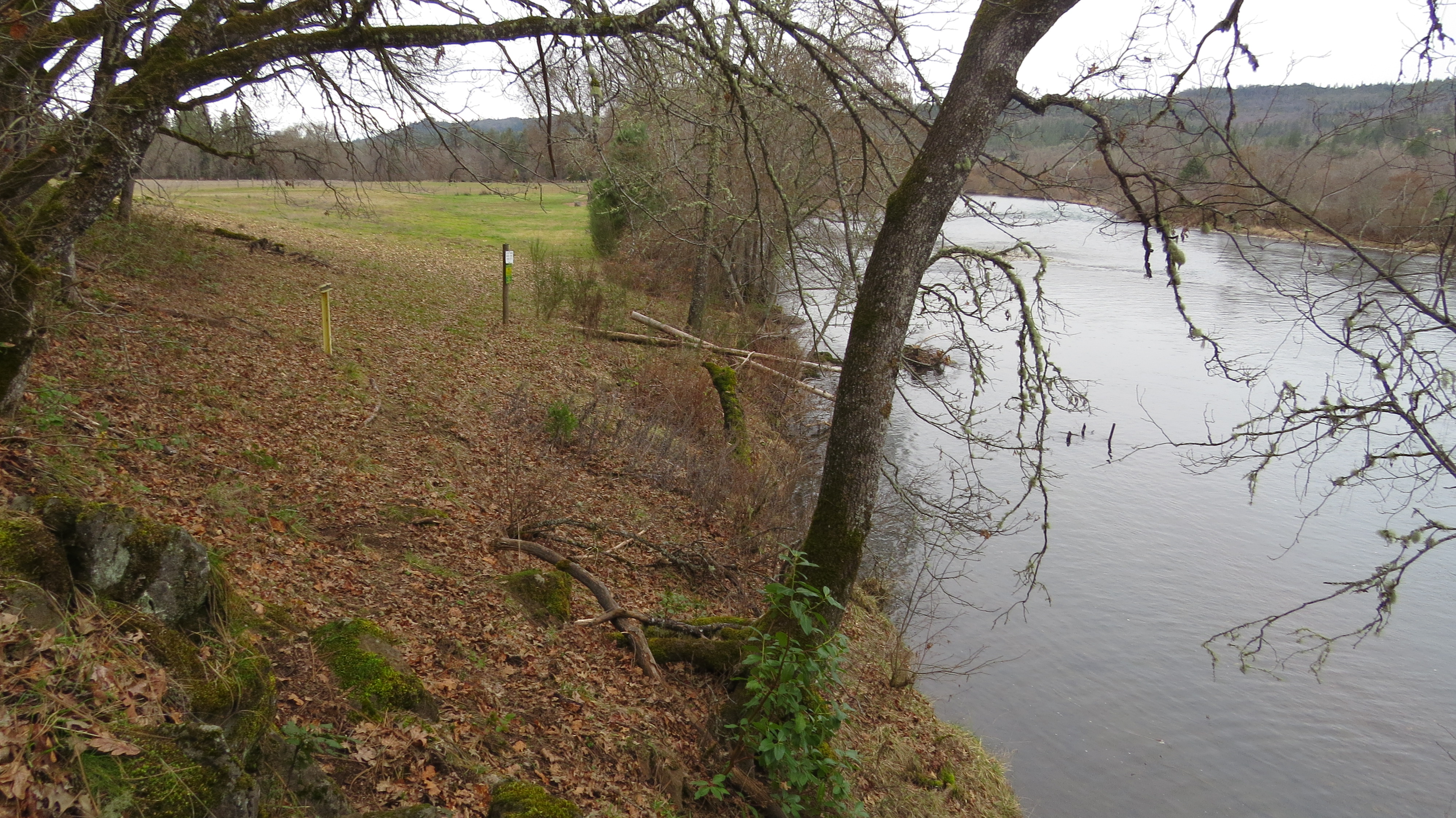 In early February of 2020, we received a message from Rick W. Rohrbough of Medford that there was a ferry marker on the Rogue River near Betts Hole. Using Google Earth, we located Betts Hole and in driving roads in the area we met Phil Shugart, who owns property on the river. He told us it was all right to walk along the river bank to find the ferry marker. We did this, and found the marker, which turned out to be for the Hannah Ferry. The sign nearby said no trespassing, so we will not give directions, but the marker can easily be seen from the river. Anyone interested should contact the owner of the 4R Ranch for permission to visit. To view the marker from the river, the GPS coordinates will be helpful: