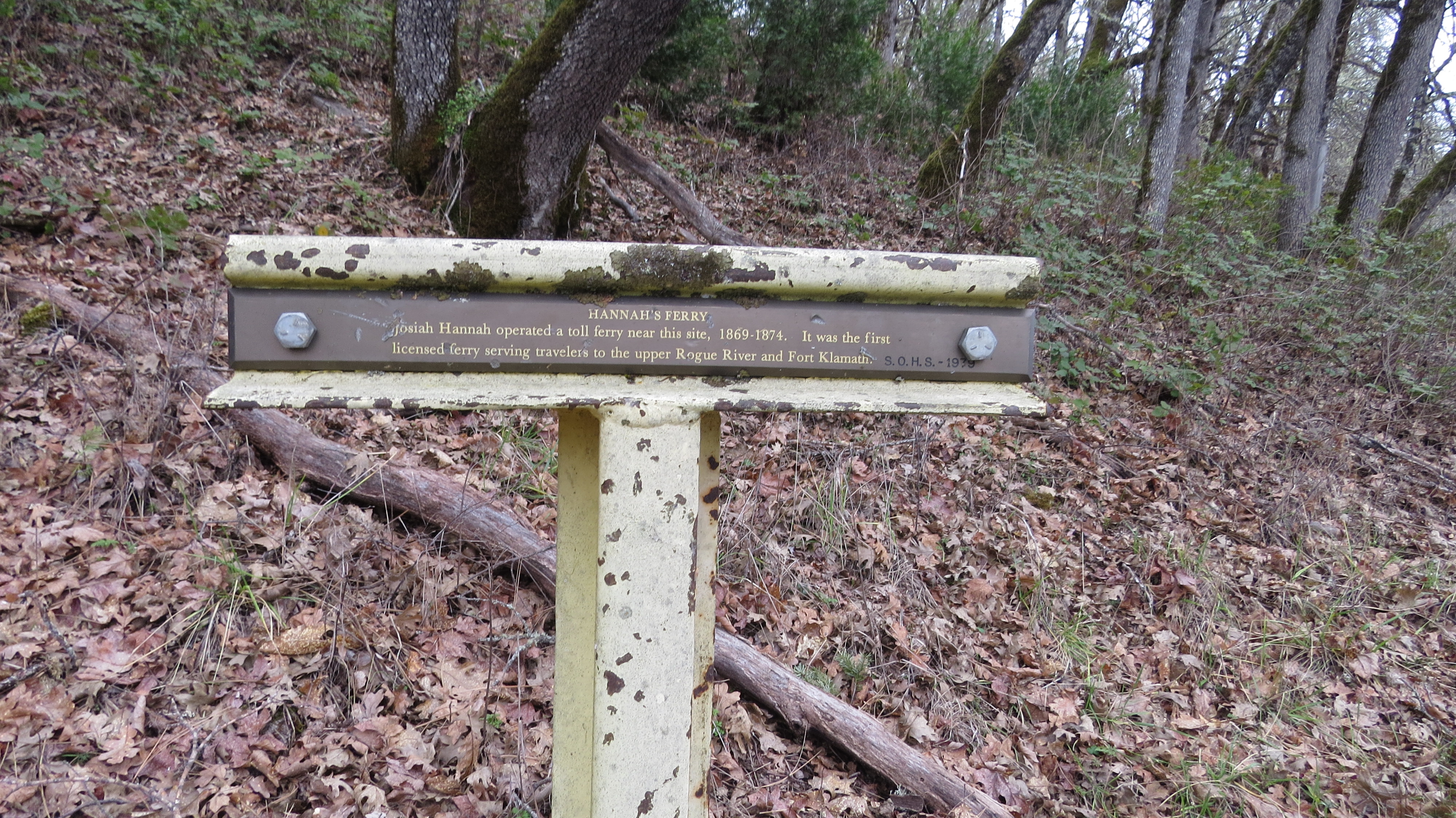 Josiah Hannah operated a toll ferry near this site, 1869-1874. It was the first licensed ferry serving travelers to the upper Rogue River and Fort Klamath.