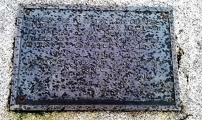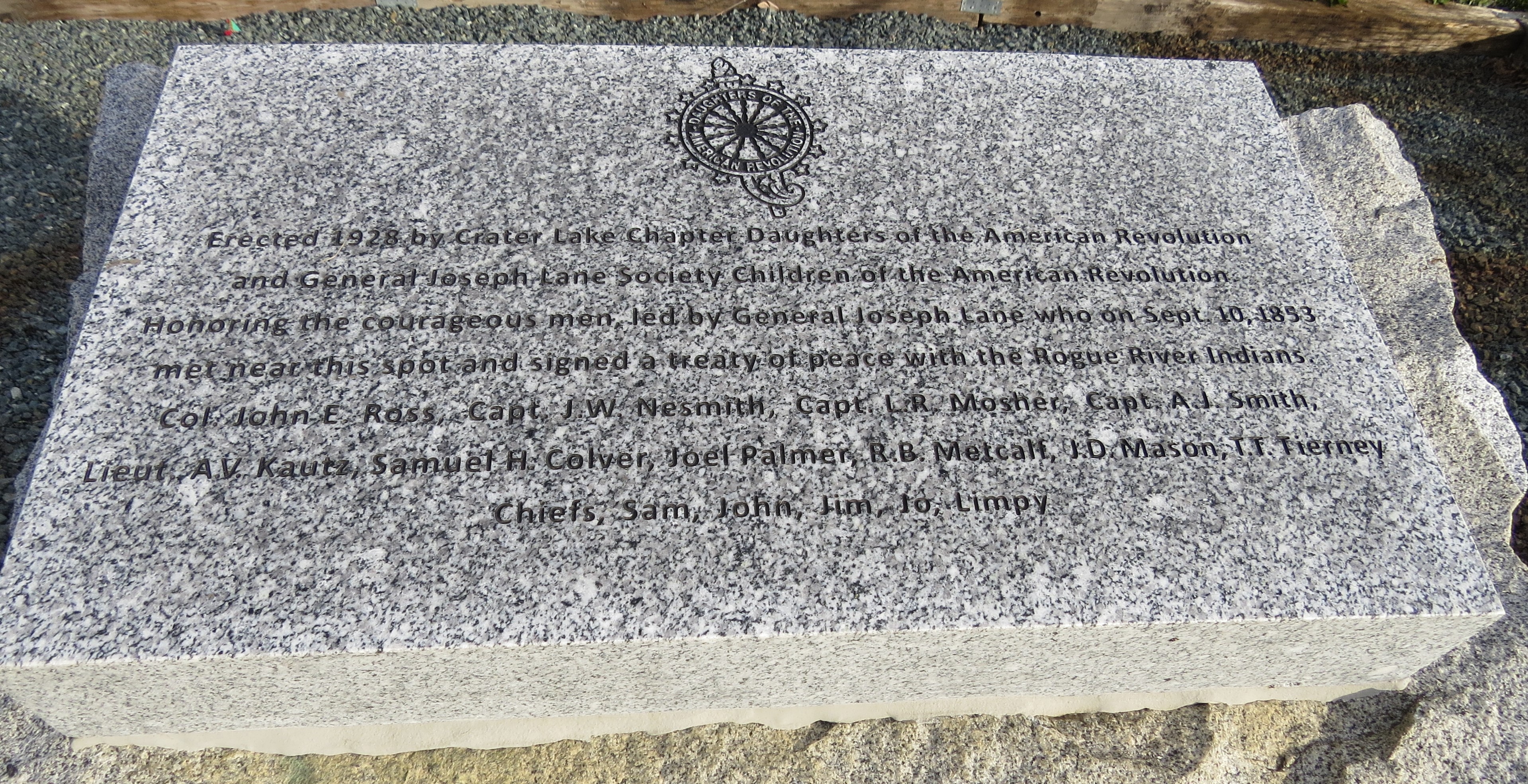 “Erected in 1928 by the Crater Lake Chapter of the Daughters of the American Revolution And General Joseph Lane Society Children of the American Revolution Honoring The Courageous Men, Led By General Joseph Lane Who On Sept. 10, 1853 Met Near This Spot And Signed A Treaty Of Peace With The Rogue River Indians”