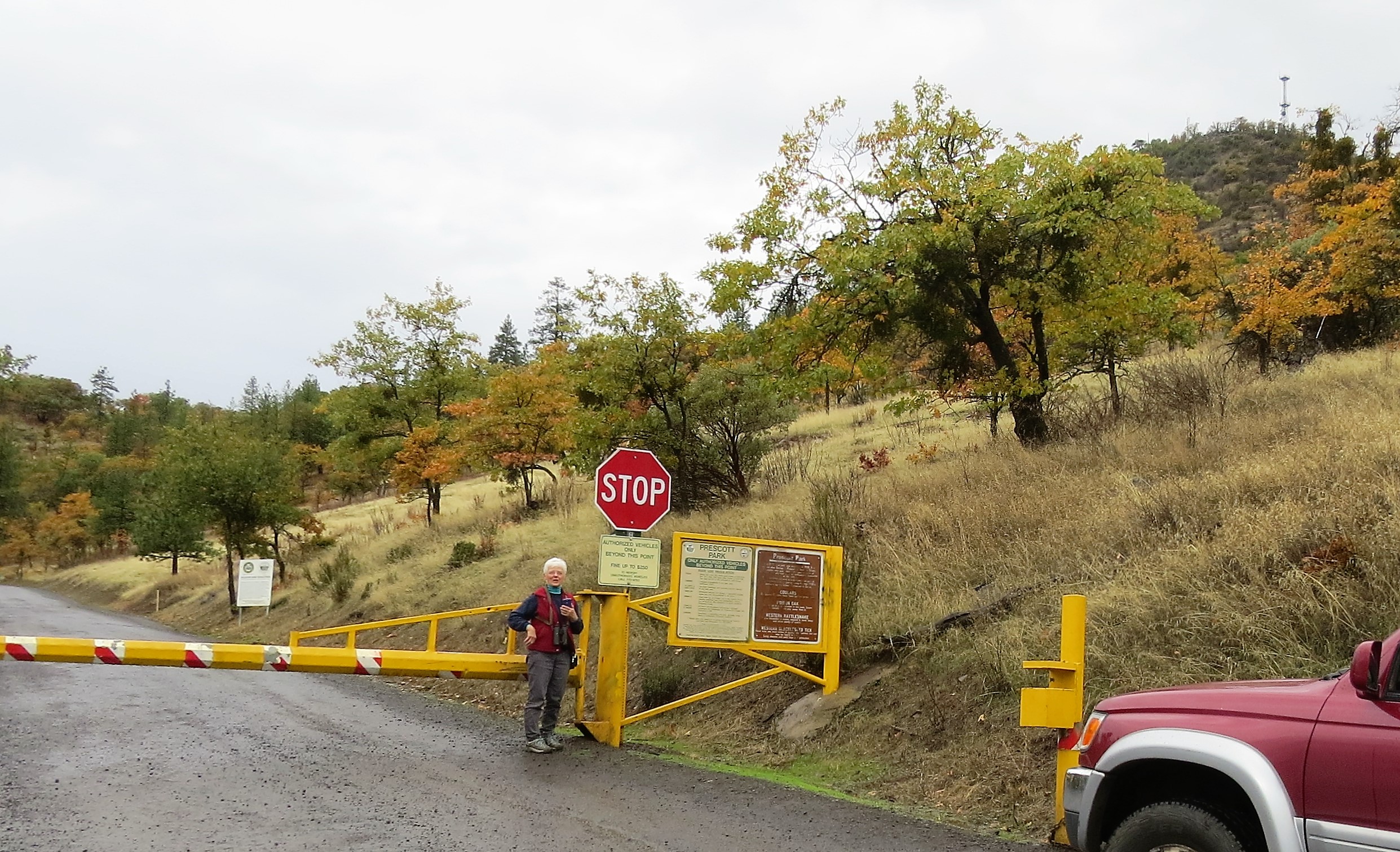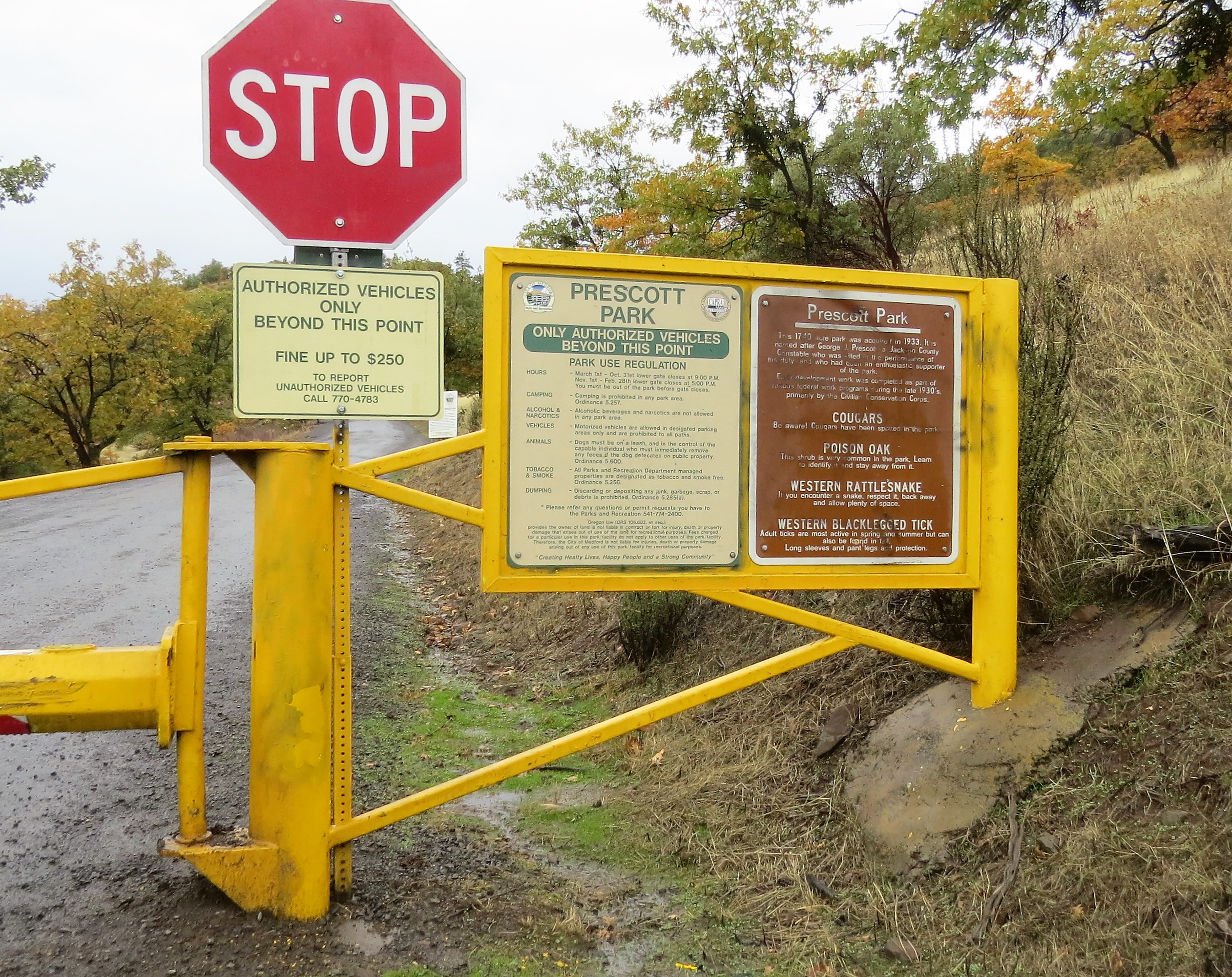 From Medford, the park can be reached by driving east on Hillcrest Road and turning left onto Roxy Ann Road. Note the signs showing when the gate to the park is closed. If the entrance gate is open, drive to the next gate, where the marker sign is located, No public vehicle traffic is allowed beyond this gate, but the park is open to foot traffic.