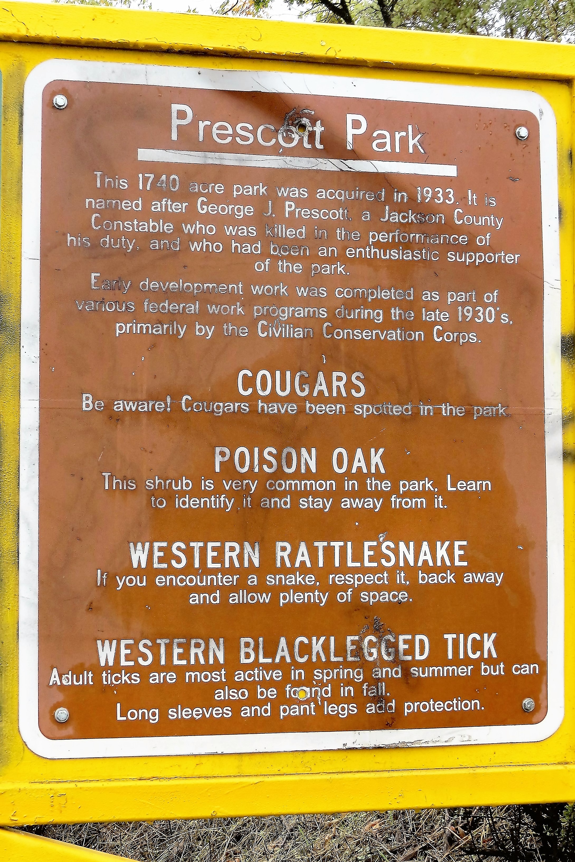 This marker is located at a gate inside Prescott Park on Roxy Ann Peak, just to the east of the city of Medford. The 1740 acre park was named in honor of Constable George J. Prescott, who was murdered on March 16, 1933 by Llewellyn Banks, a leader of a movement known as the Jackson County Rebellion, and also called the Good Government Congress.