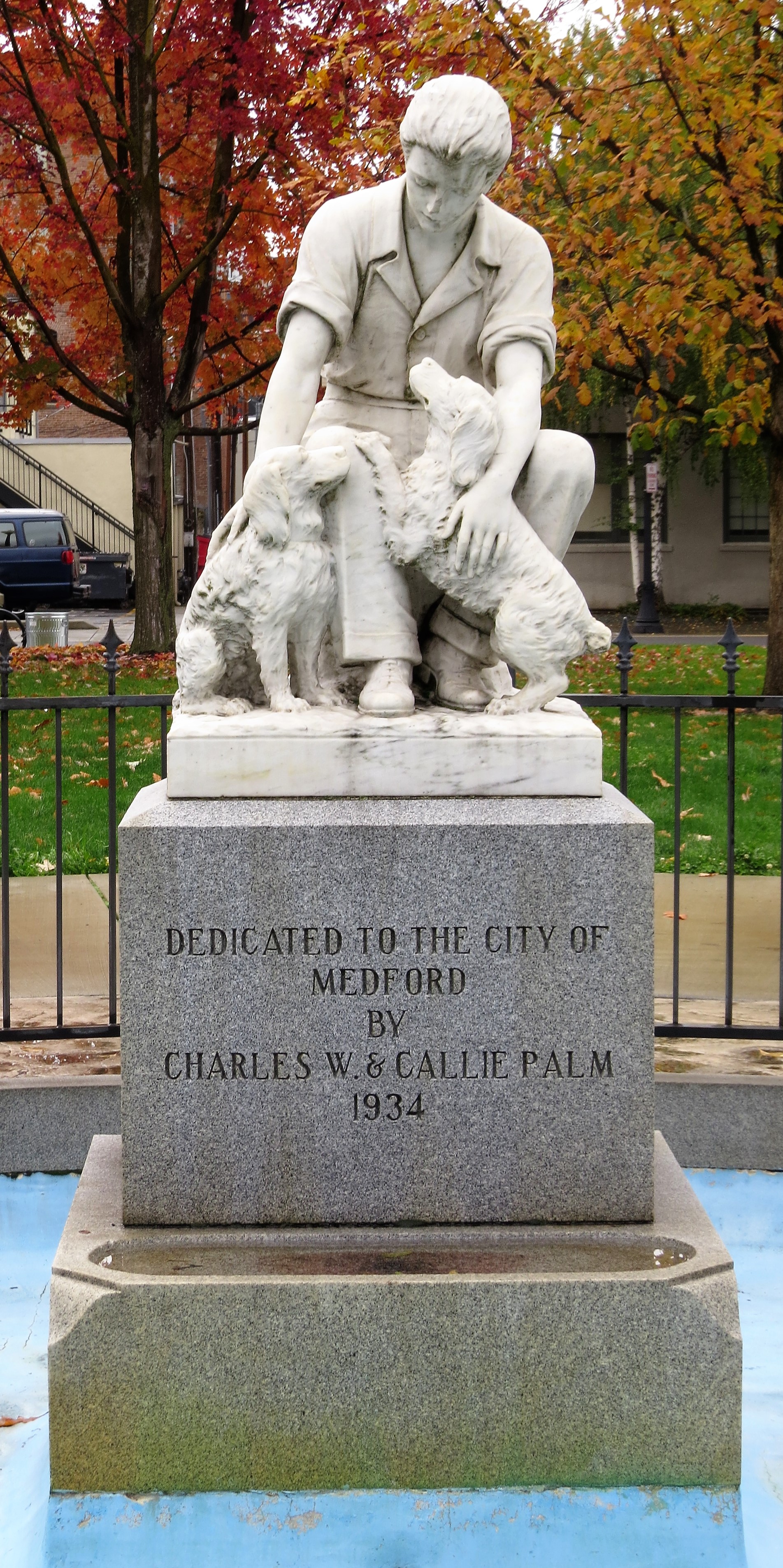 The statue depicts a young man with two dogs. The boy represents youth, strength, hope and happiness. The Palms were devoted to their dogs, and thought of dogs as man's best friend. During the dedication of the statue it was noted that the installation provided fresh water for people and for dogs, as well as a bird bath. It was especially noted that the water in the fountain came from Medford's new water supply system, bringing fresh mountain spring water to the city in place of the water from Bear Creek, which was used previously.