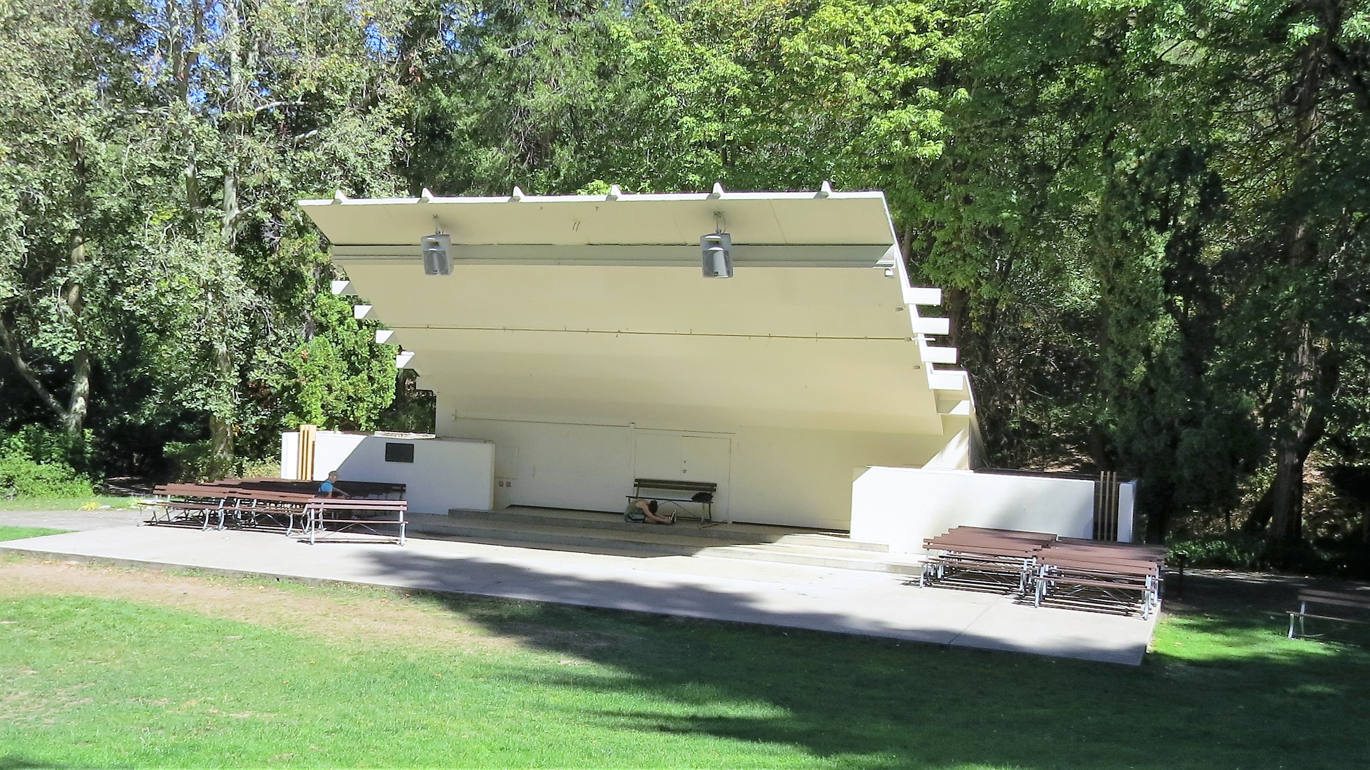 The bandshell is located in Lithia Park, Ashland. It can be seen from Winburn Way, just a few blocks up from the Plaza.