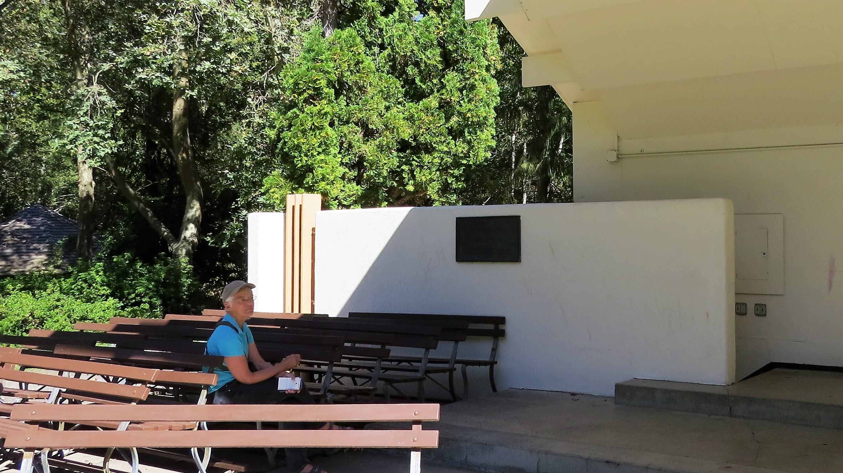 In 1949, a bequest from the will of Gwin Butler, a prominent local business man, was used to build this bandshell. The plaque states that the bandshell was erected in memory of Gwin Samuel Butler and his wife Alice Barron Butler. Both were children of pioneers to the Rogue Valley. The bandshell is used extensively in mild weather, Including for Ashland City Band concerts during the Summer.